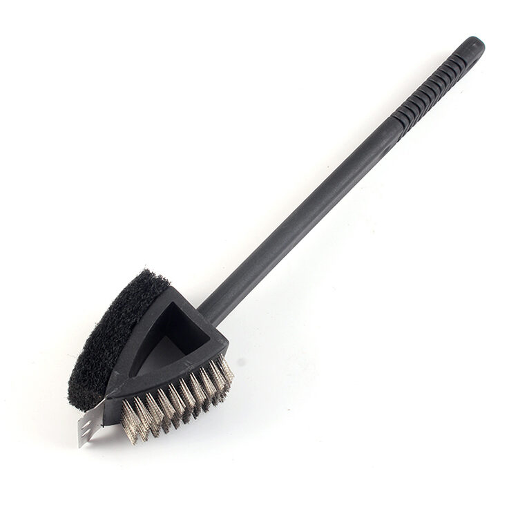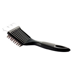 Brush has sturdy metal bristles that get even the toughest messes clean.Quickly cut through grease and residue buildup without scratching grill bars with this samll grill brush featuring a durable, compact brush with heavy duty metal bristles and a scraper blade.Brush has a comfortable ribbed handle with a hang hole for easy storage.Head scraper blade makes it easy to chip off stubborn debris.